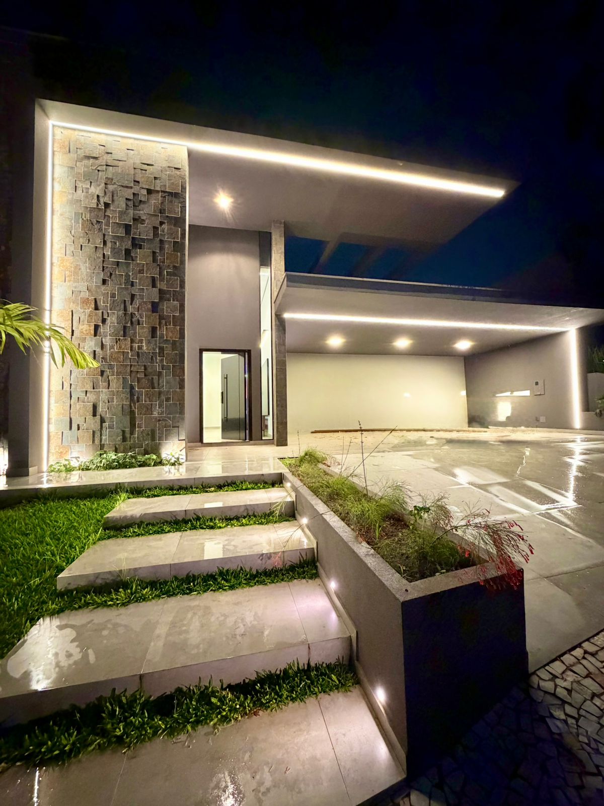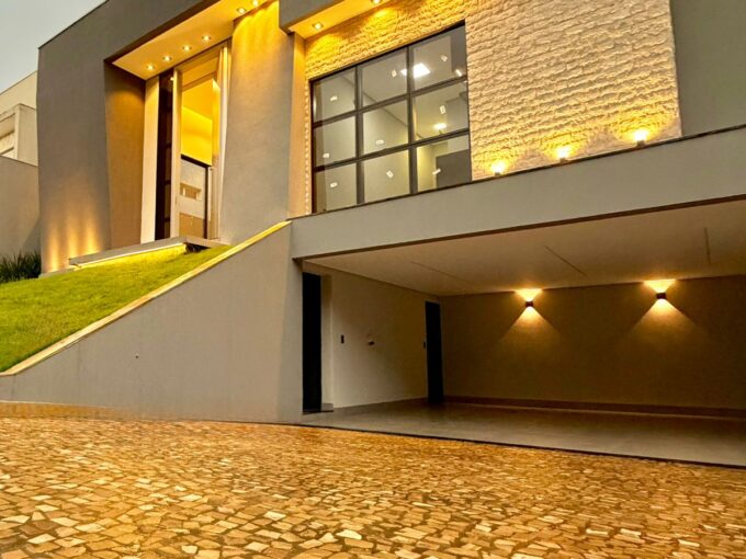 Implantada em um terreno de 430 m², com 14 metros de testada, a residência oferece 260 m² de área construída, distribuídos de forma inteligente e fluida. A chegada já impressiona com a garagem para até 6 veículos, reforçando a sensação de porte e conforto.