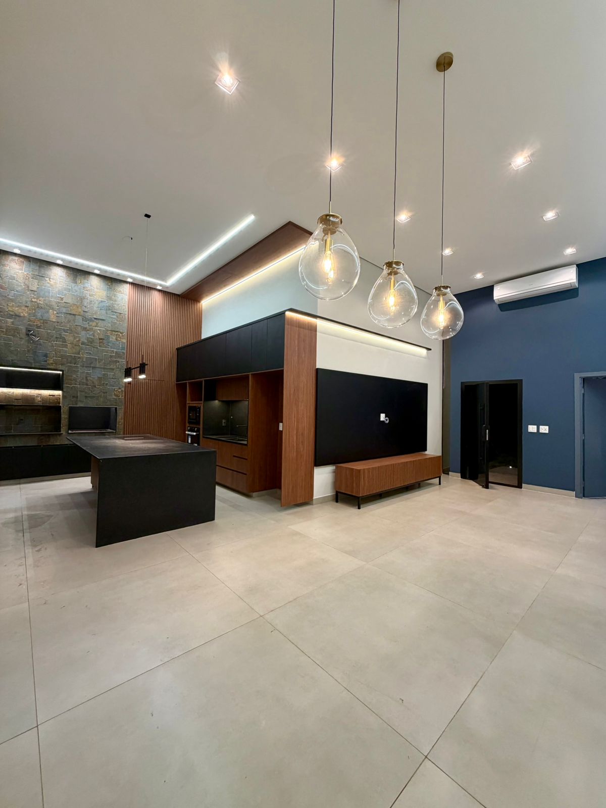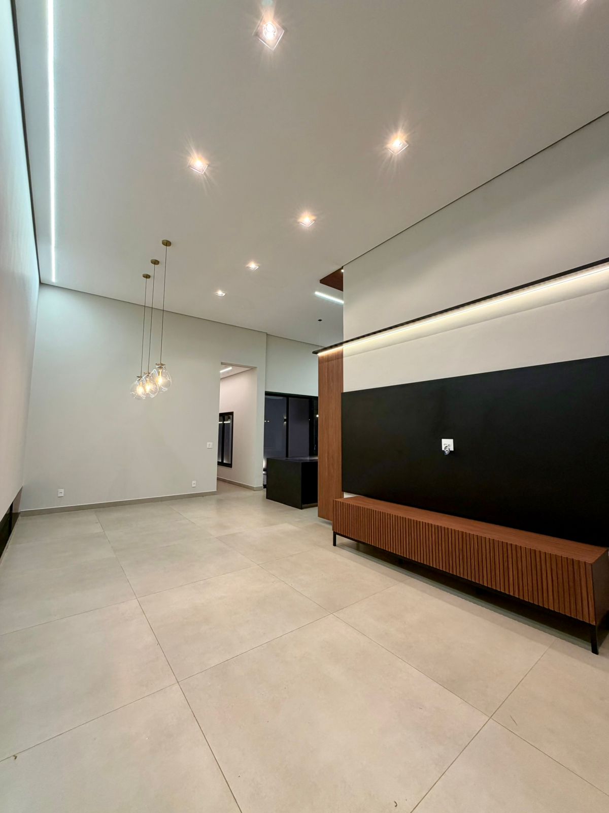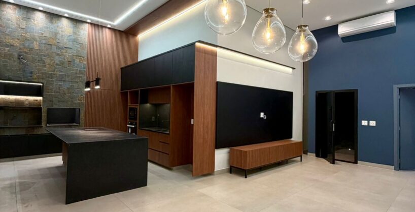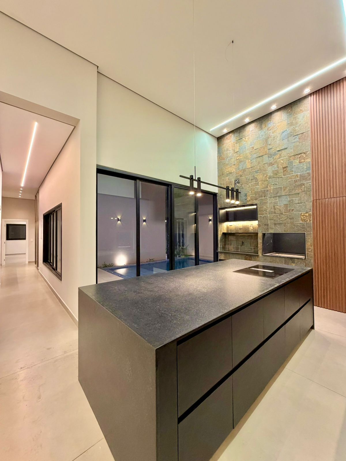 O interior revela ambientes sociais amplos, com pé-direito elevado, iluminação arquitetônica precisa e integração total entre salas, cozinha e área gourmet. Tudo pensado para receber bem, com estética contemporânea e atmosfera acolhedora.